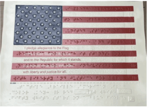Charlotte Shelburne shared copies of the paper Braille flags. She has 5 that will be placed in frames. She has a date the first week in May at LafayetteAcademy and will be working with the Orchard Farm School District and the others. The picture above is of a document with a Braille flag and the Pledge of Allegiance in Braille that the Flag of the United States ofAmerica Committee will be distributing at the schools our chapter supports.