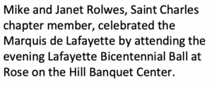 I was pleased to present the program “AI for Genealogy” atthe SAR Missouri State Convention on April 25, 2025. It was well attended and there were many questions after the program. I was so happy to see many SAR friends and even some DAR sisters from around Missouri. Steve Kling gave the presentation after mine and spoke on Lafayette’s tour stop in St. Louis and Kaskaskia. It was very interesting. ~Patti