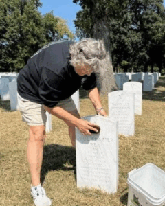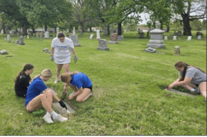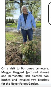 On Wednesday, April 23, 2025, the Duchesne High School girls’ soccer team joined us for a short lesson on the history of Borromeo Cemetery and headstone cleaning with Bernadette Hall and Maggie Huggard. What a wonderful experience! The Historic Preservation Committee and the Conservation Committee are working together to establish a ‘Never Forget Garden’ in St. Charles Borromeo Cemetery. The benches are installed and 2 plants in place (see above). There are plans to add more plants when the season is correct to add them. Time was spent with the Duchesne girls’ soccer team cleaning headstones and teaching them about the different types of headstone material and where it comes from along with the different types of grasses in the cemetery and of course a history lesson was included. Plans are being formed to establish an ongoing relationship with Duchesne High School and the care of the cemetery.
