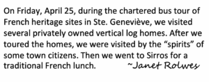 Members of the chapter took a day trip to Sainte Genevieve, Missouri, where they met with DAR sisters from the Sainte Genevieve Settlement Chapter, NSDAR. They took a tour of the city, visited the French Colonial America Museum, and enjoyed lunch together. Prospective members and members of the Cahokia Chapter, NSDAR, and the Cornelia Greene Chapter, NSDAR, attended.