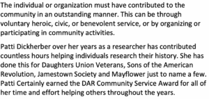 • Tricia Crouch – recognized with a Certificate for Support of DAR/SAR/S.R. Relations