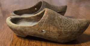 Bernadette Hall shared these family treasures with us. “The first Item was the copper cow bell that was on the family cow when my 3rd Great Grandfather, John Durbin (1762-1845), migrated from Frederick Co., MD to Know Co., OH in about 1815. It is approximately 210 years old. The second item: “These shoes are the souvenir that my grandfather, Austin James Durbin (1889 – 1942), brought backfrom WWI where he was stationed in France (1918 – 1920). He spent most of his time in France in the hospital as he contracted tuberculosis while stationed there. His service records were destroyed in the fire. He actually enlisted in St. Louis. They are wooden baby shoes. They are approximately 105 years old.