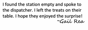 I delivered cookies to Central Fire and Rescue Station No. 3 on Willott Road. The firefighters were surprised and happy to get the goodies. – Susie Weaver