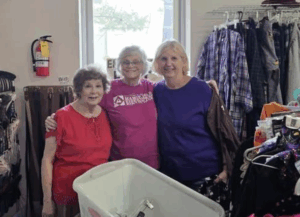 At the Calvary Temple Clothing Closet – Ann Puri, Donna Lapinski and Tricia Crouch transitioned the clothes from summer to winter. Photo by Bernadette Hall