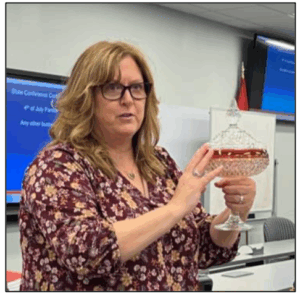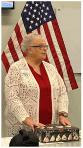Cheryl Burtle brought a crystal ice bucket and a candy dish for her family history story. The candy dish was her Grandmother’s in her patriot line. “She was my best friend.” She always had divinity in the dish at Christmas. We went on trips and shopping together.