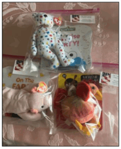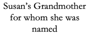 Susan Russ shared information about her name. Susan is the 8th in her family named ’Susan’ since 1749. Susan’s granddaughter (pictured above) is the 10th. The first Susan was Susan Ross Crane, the second wife of Henry Weaver, Susan Russ’ Revolutionary War patriot. Susan brought and shared the mirror, brush and button hook from a dresser set that was her grandmother’s. Growing up, Susan shared a bedroom with her maternal grandmother who lived with Susan’s parents. She also brought doll clothes from her childhood that her grandmother made for her. She shared memories about the items and the special meaning and importance they have for her.