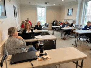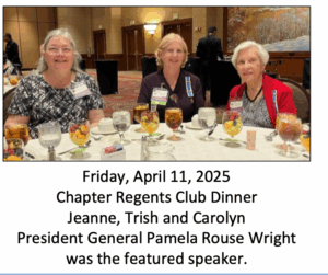 “DAR Presents: Find Your Revolutionary War Patriot” The workshop was given on March 29, 2025 by the O’Fallon Chapter, NSDAR headed by Megan Atchley (O’Fallon Chapter) and held at the St. Charles Heritage Museum. Kate Huffman from the O’Fallon Chapter was also there helping people fill out their family charts. Carol Selph and I attended the Workshop and were pleased to talk to a number of interested prospectives. We are not pictured because whoever took this picture stood in front of us to take a shot of the room.
