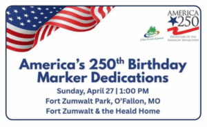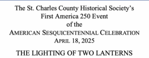The St. Charles County Historical Society (SCCHS) put on its first America 250 Event of the American Sesquicentennial Celebration. The Lighting of Two Lanterns was held on the steps of the St. Charles County Historical Society on Main Street in St. Charles, Missouri. This lighting was done on 18 April 2025 to commemorate the 250th Anniversary of “two if by sea” and Paul Revere’s midnight ride which took place 18 April 1775. Historical sites across the United States celebrated in the same way.