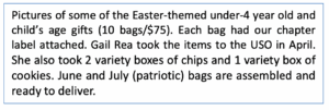 What a busy meeting! New Transfers, Eppie and Grace Underwood, Installation of new members, Jennifer Neumann, Katy McKinney,Kira Brennam and DeAnn Holden, Patriot of the Month, Colette, Ellen, Nancy, Jeanne and Kathleen, Guest Cary Warner from the USO, and Ann Puri showing her greatgrandmother’s quilt. We had such a great meeting!