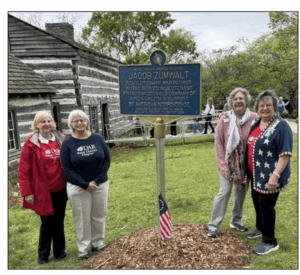 Saint Charles DAR chapter members joined with the Caroline Close Stuart DAR chapter at Fort Zumwalt in O’Fallon, MO., for the dedication of a Pomeroy Foundation American Revolutionary Marker honoring Jacob Zumwalt and an America 250! Marker at Heald House.