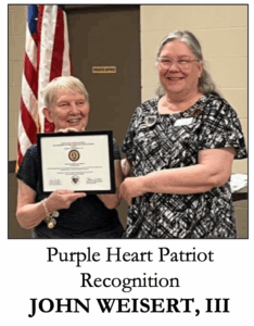 • Chapter recognized with a Certificate: Support of Purple Heart Patriots Certificate of Appreciation for Service to America