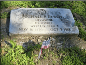 We had a very productive morning in Borremeo yesterday. Cleaned some Veterans, found and uncovered a lost headstone. A student from Duschene High School came and he cleaned the area around 2 flat stones. We really enjoyed sharing the history of the cemetery with him and what DAR is all about.