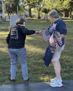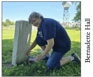 St Charles Borromeo entry way is all set up /decorated for tomorrow’s plaque dedication. Many hands made it go quickly. Jeanne Middleton brought a couple grandchildren – James and Cora to help place the flags. HODAR Ben Crouch came out this morning with his weed trimmer & blower to start the job of clearing some of the sunken stones ~Maggie Huggard