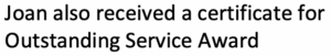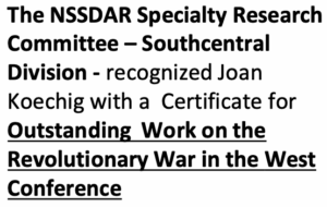 • Joan Koechig – recognized with a Certificate for Support of DAR/SAR/S.R. Relations