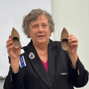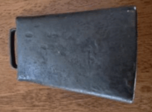 Bernadette Hall shared these family treasures with us. “The first Item was the copper cow bell that was on the family cow when my 3rd Great Grandfather, John Durbin (1762-1845), migrated from Frederick Co., MD to Know Co., OH in about 1815. It is approximately 210 years old. The second item: “These shoes are the souvenir that my grandfather, Austin James Durbin (1889 – 1942), brought backfrom WWI where he was stationed in France (1918 – 1920). He spent most of his time in France in the hospital as he contracted tuberculosis while stationed there. His service records were destroyed in the fire. He actually enlisted in St. Louis. They are wooden baby shoes. They are approximately 105 years old.