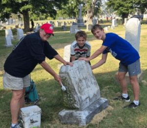 Friday, the St. Charles Chapter DAR Historic Preservation & Conservation groups had the wonderful opportunity to work with the Boys Soccer teams from DHS at the historic St. Charles Borromeo Cemetery! These YOUNG MEN were AMAZING! They were hard working and enjoyed learning the history as well as new skills as they helped with cleaning and clearing monuments as well as gardening and general grounds care. It was wonderful to have their enthusiasm & energetic help on this HOT afternoon. It was over 95! So glad we had lots of drinking water. Working alongside & having the opportunity to chat with them was very rewarding. ~Charlotte Shelburne